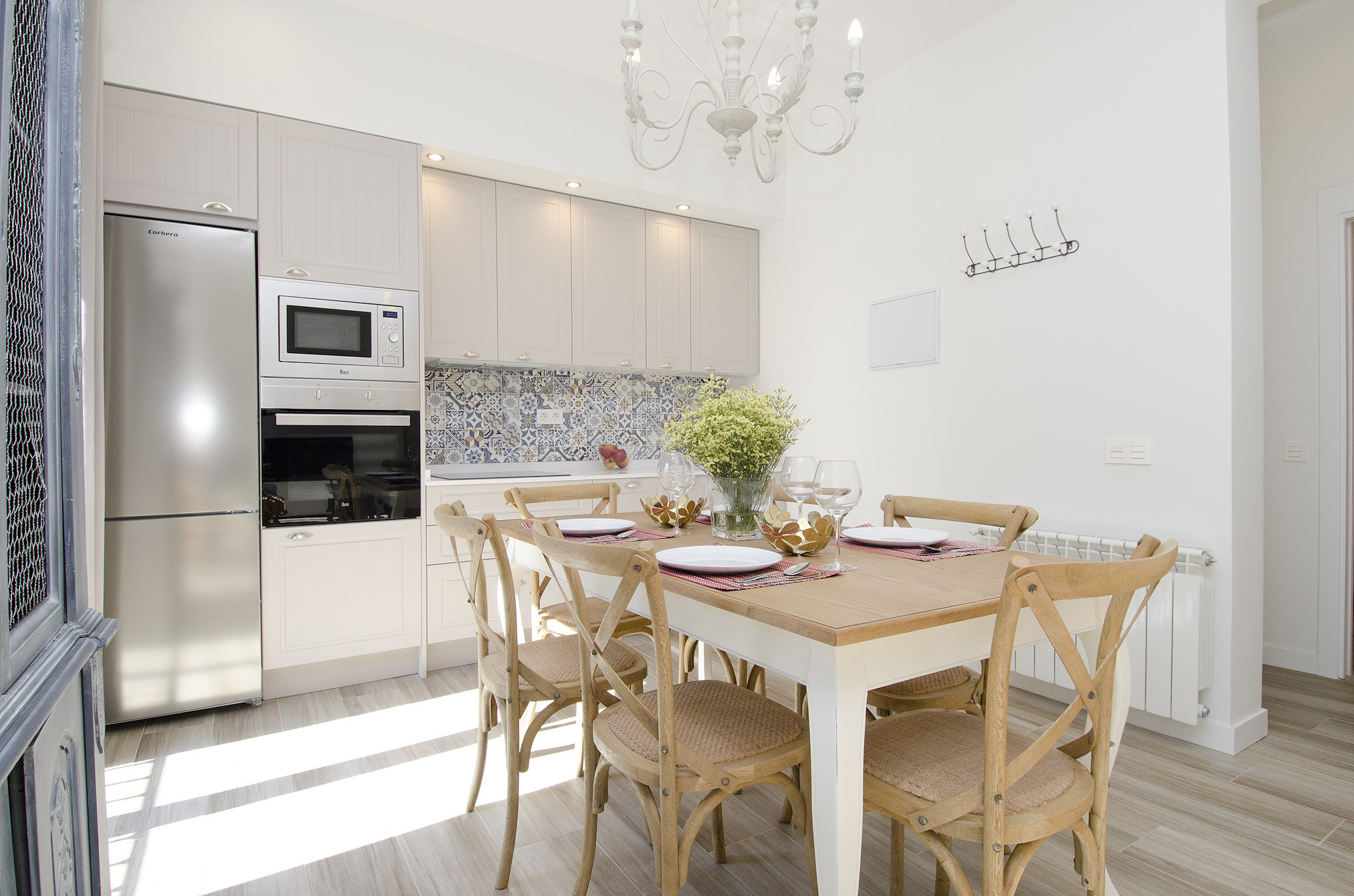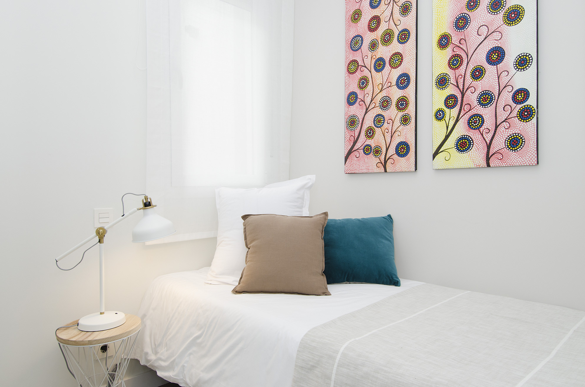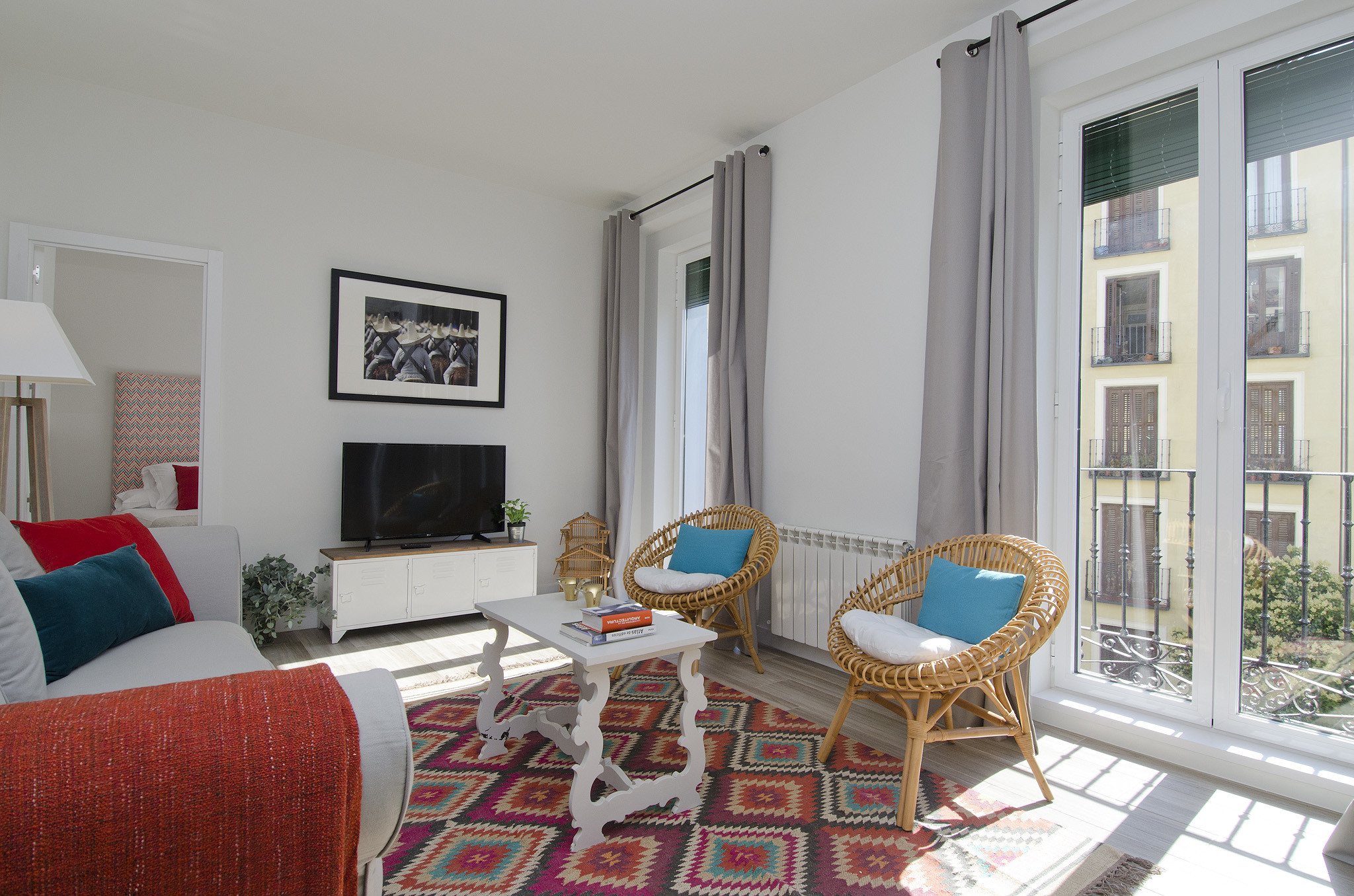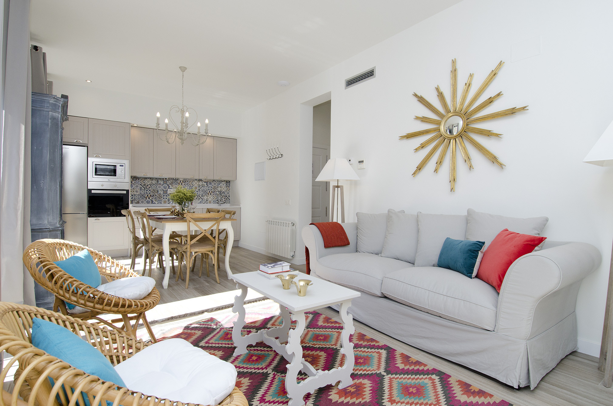 Resaltan la decoración al más puro estilo boho chic, el mobiliario de colores combinado con toques étnicos, el papel pintado y los materiales naturales que enamorarán a los huéspedes del apartamento.