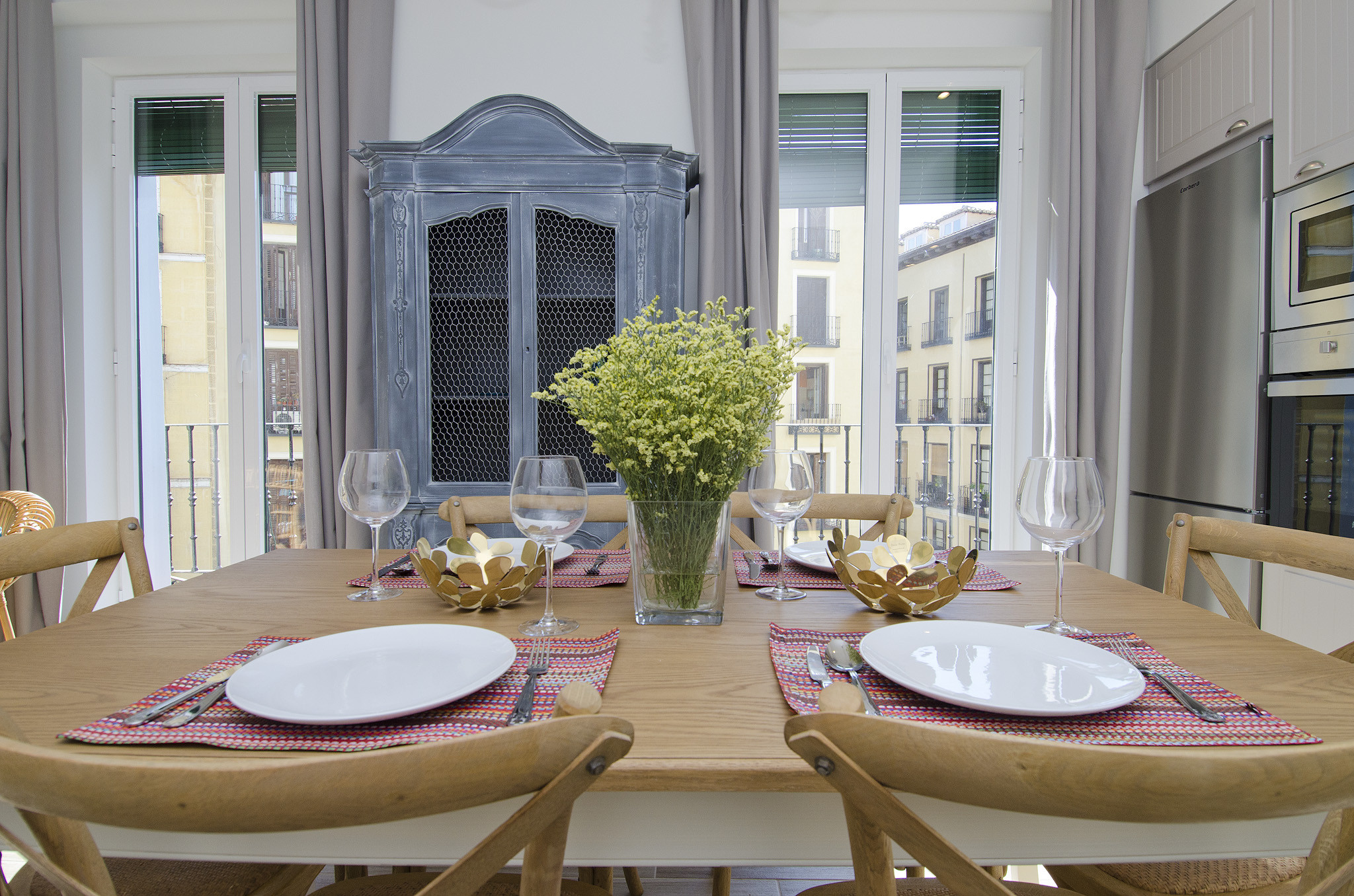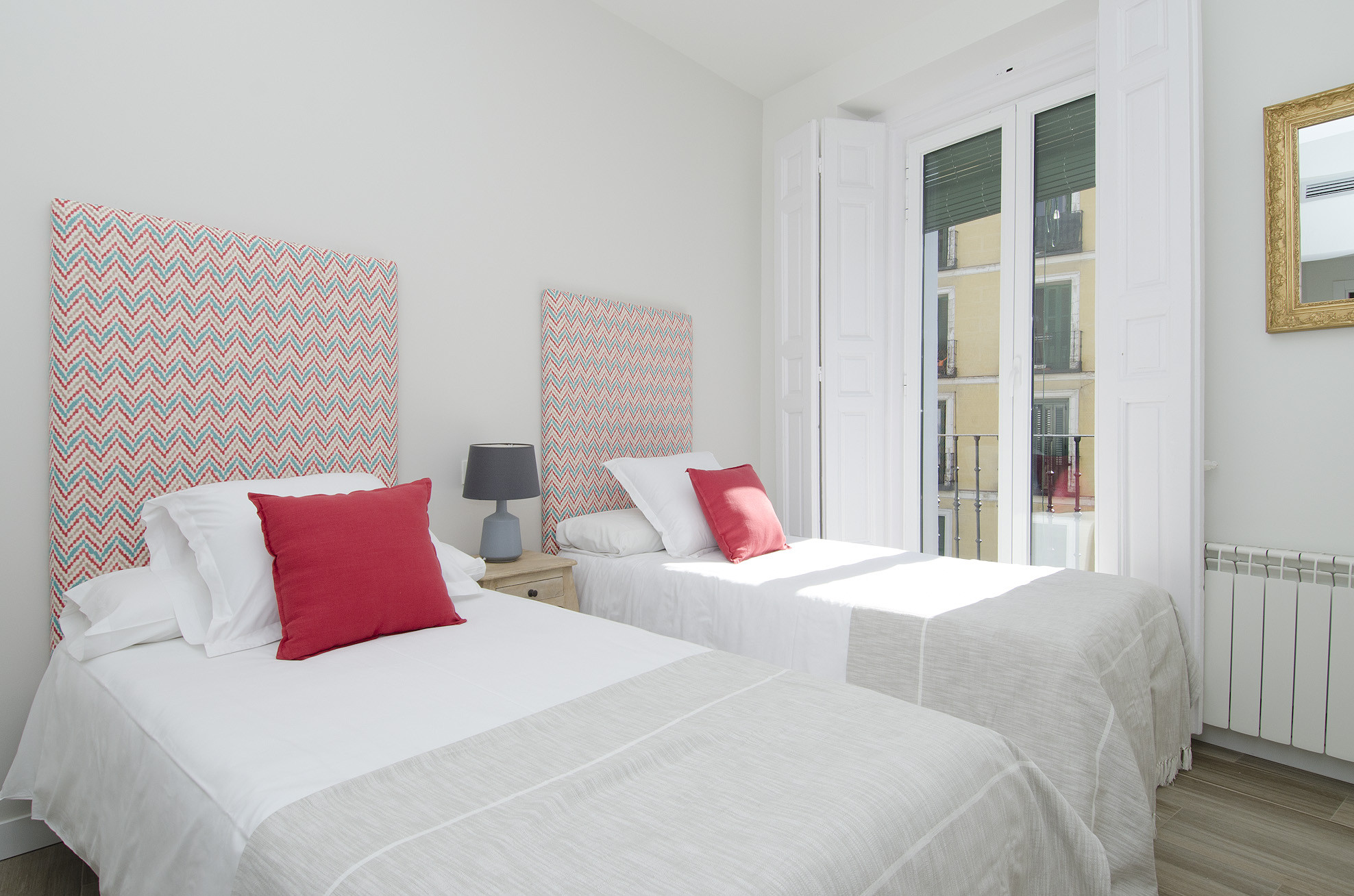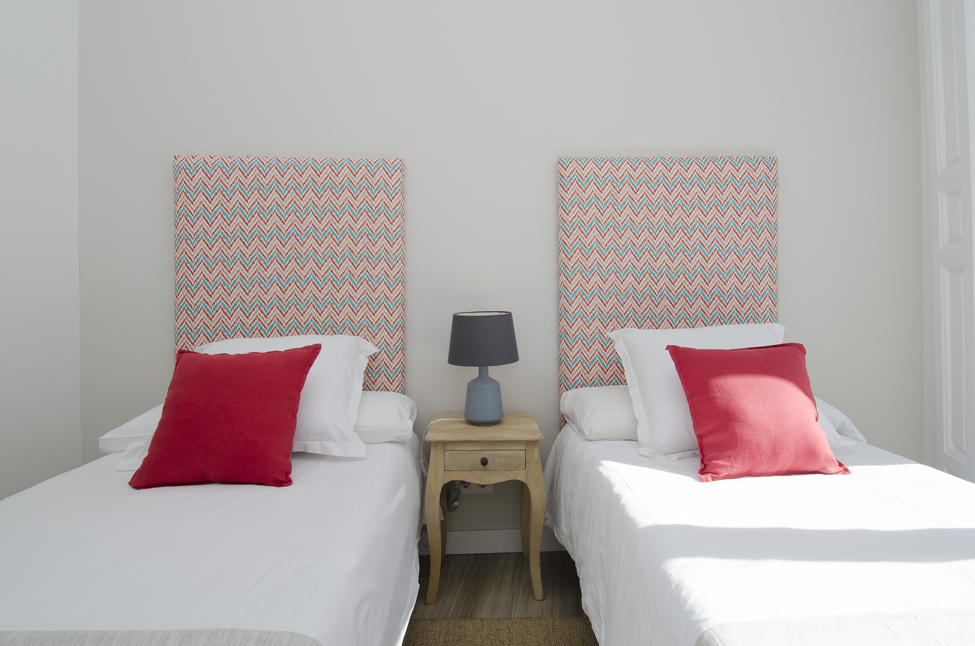 El apartamento ha sido reformado buscando la comodidad y modernidad de los espacios, aprovechando también su gran luminosidad. Tiene capacidad para 7 personas distribuidas en 3 habitaciones, una con ventanal a la plaza y las otras dos con ventanas que dan al interior. Hay dos cuartos de baño completos y un aseo adicional.