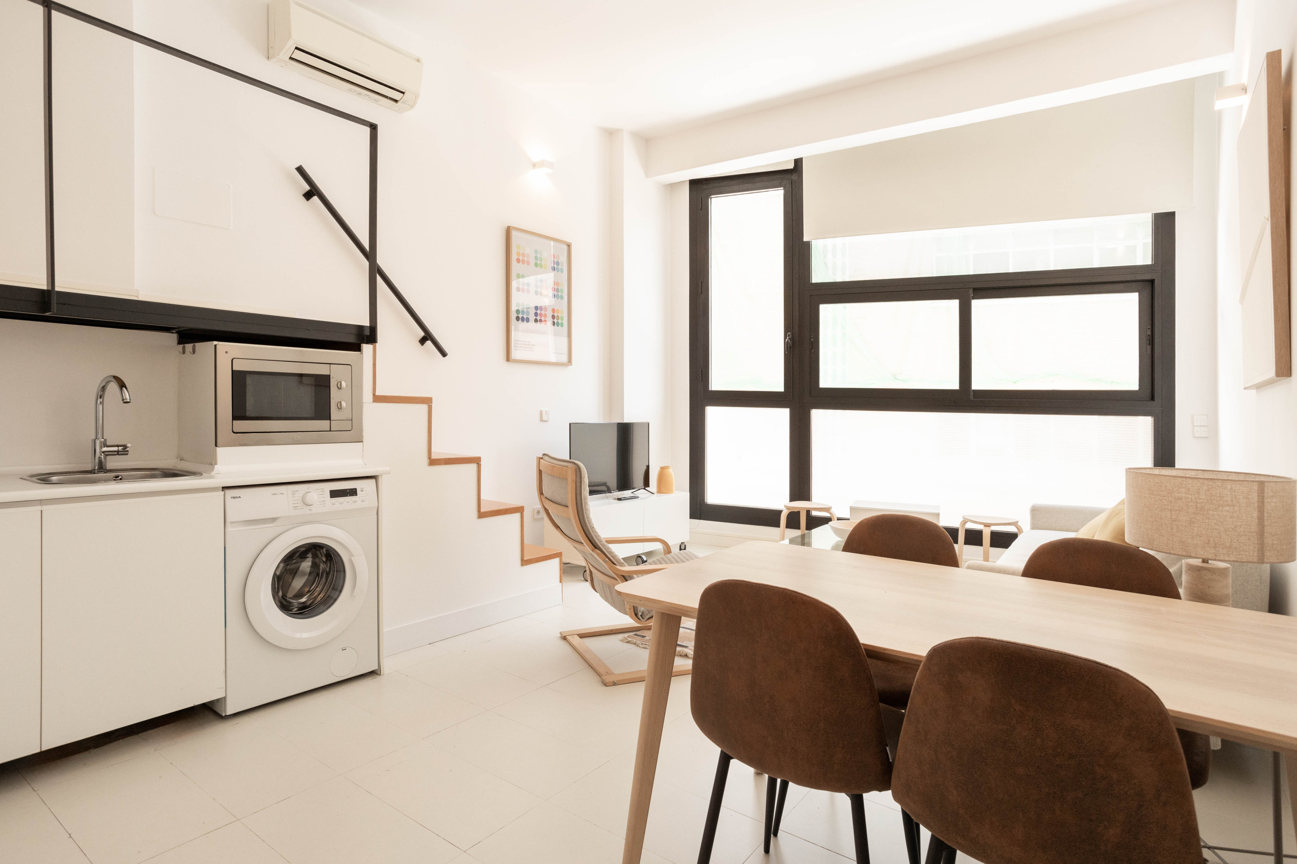 The ground floor integrates the living room and kitchen, providing comfort and practicality to the space. The living room features a Smart TV, an elegant dining table and a comfortable sofa bed with capacity for two people. Also on this floor is located the bathroom with shower